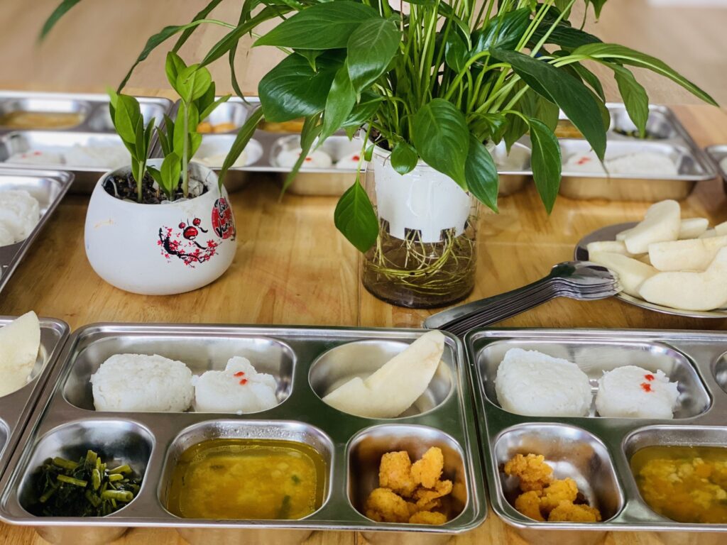 - Thực phẩm tươi ngon và đa dạng: Chúng tôi sử dụng thực phẩm tươi sạch, đảm bảo an toàn thực phẩm và chất lượng dinh dưỡng. Các bữa ăn hàng ngày bao gồm rau củ, trái cây, ngũ cốc nguyên hạt, protein từ thịt, cá và đậu.