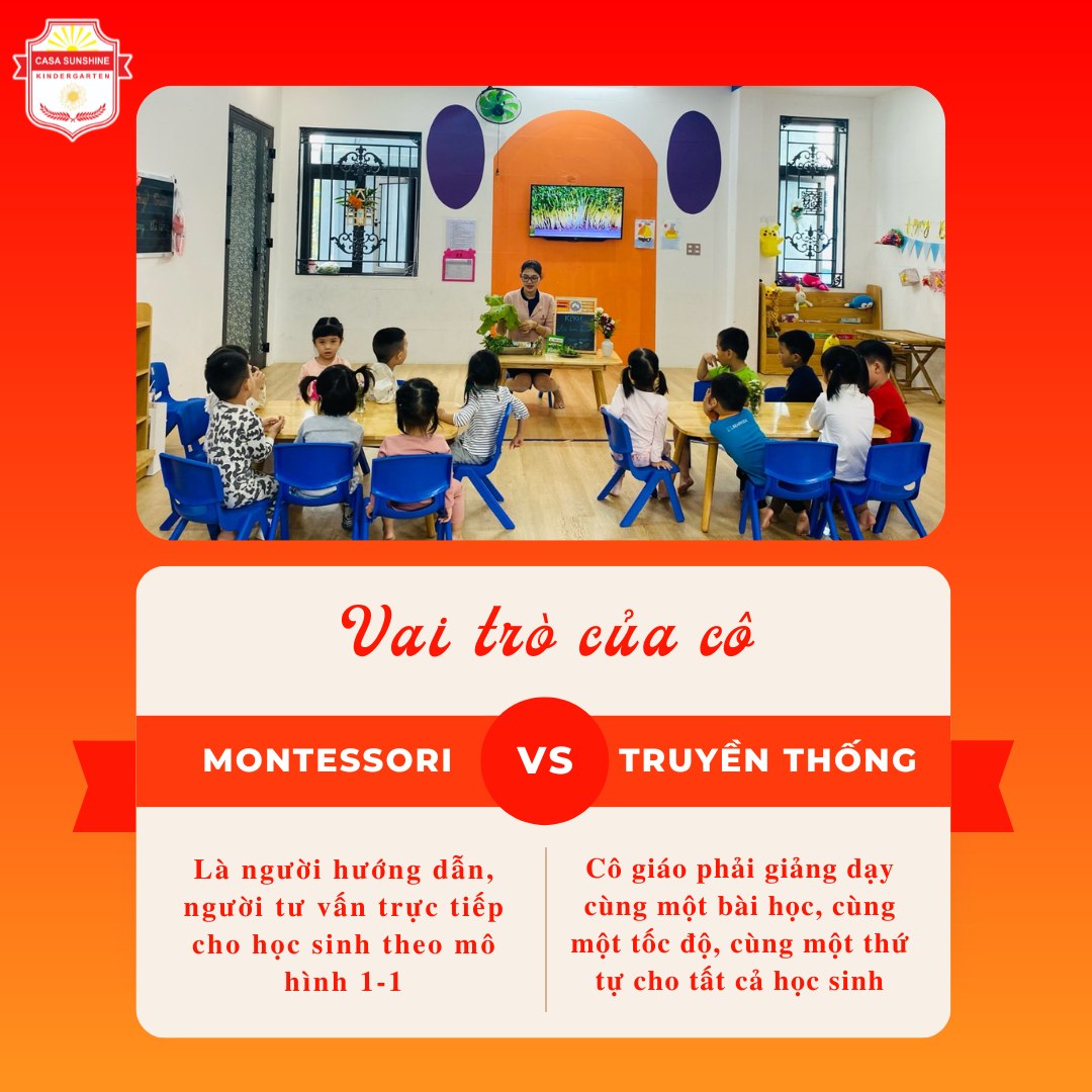 - Montessori: Giáo viên đóng vai trò như người hướng dẫn, giúp trẻ phát hiện và khám phá kiến thức mới. Họ tạo ra môi trường học tập mà trẻ có thể tự do khám phá.
